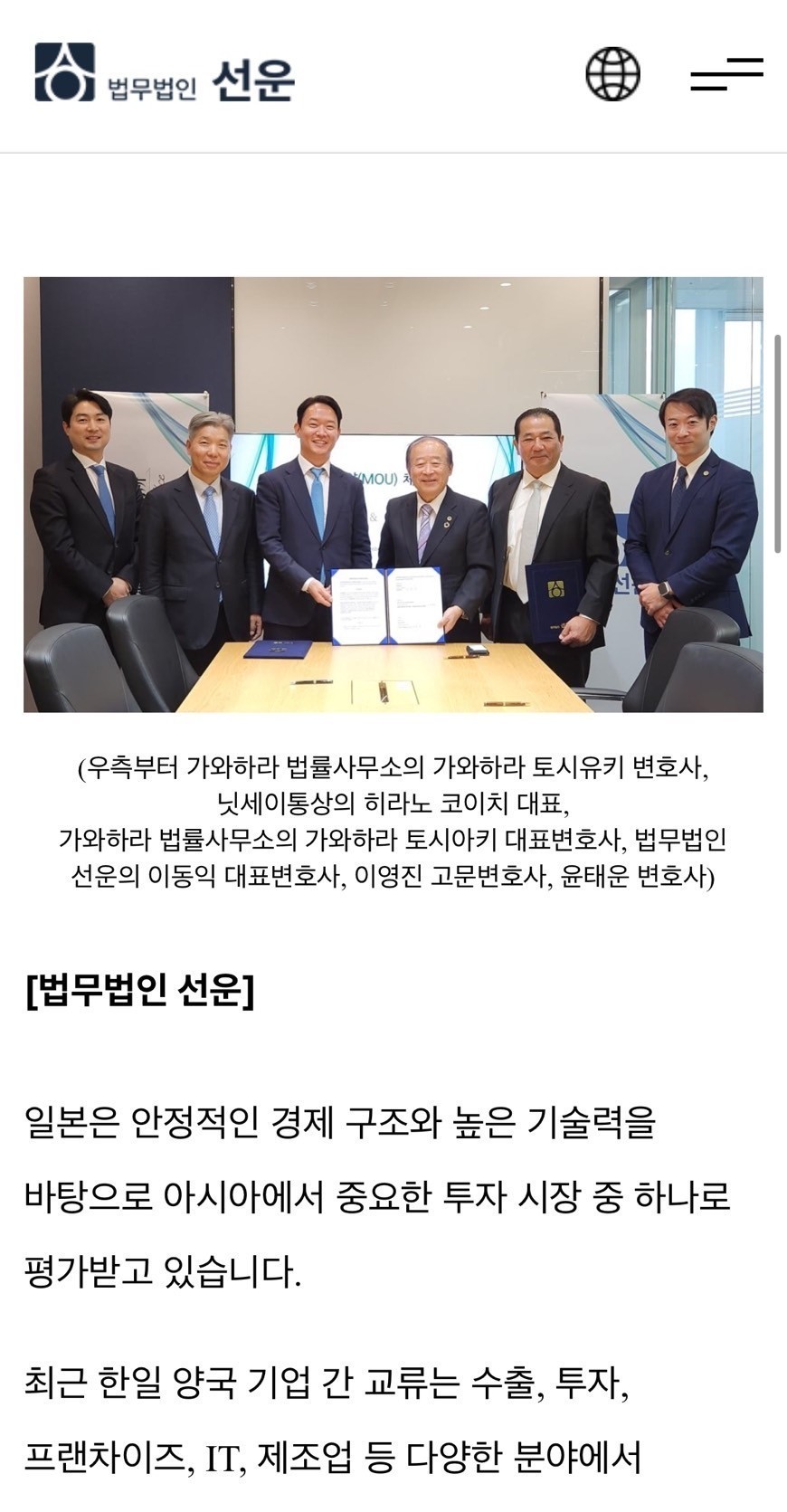 今回ご紹介いただいた韓国の弁護士法人SUNWOON(サヌン)は、李栄真弁護士を顧問とし、李代表弁護士を中心に韓国でもご活躍されている、とても優秀な法律事務所だと伺っています。そんな事務所と私たちが手を取り合えることは、まさに光栄の極みであります。
